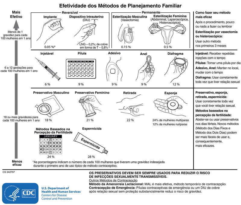 Extraído de Centers for Disease Control and Prevention, Division of Reproductive Health, CS 242797; adaptada de World Health Organization. Comparing typical effectiveness of contraceptive methods. Geneva, 2007, World Health Organization, and from Trussell J. Contraceptive failure in the United States. Contraception 83:397-404, 2011.